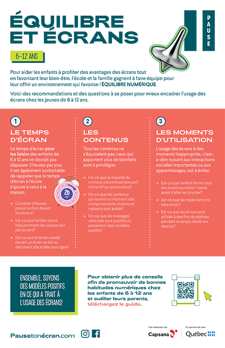 Affiche synthèse destinée au personnel des écoles primaires qui résume les clés pour un usage équilibré des écrans chez les 6 à 12 ans : recommandations, questions à se poser et lien vers un guide complet.