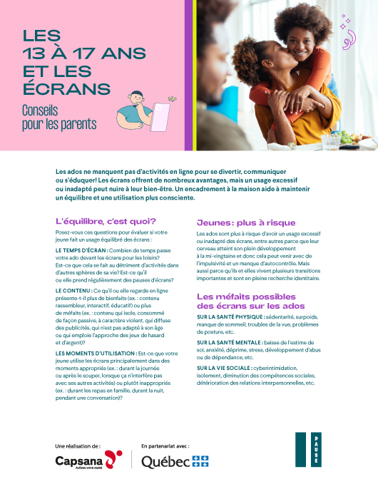 Fiche-conseil résumant les informations clés en lien avec les écrans pour les parents d’ados de 13 à 17 ans : définition de l’équilibre numérique, rappel des méfaits potentiels ainsi que des recommandations et des stratégies pour passer à l’action et avoir un usage plus équilibré.