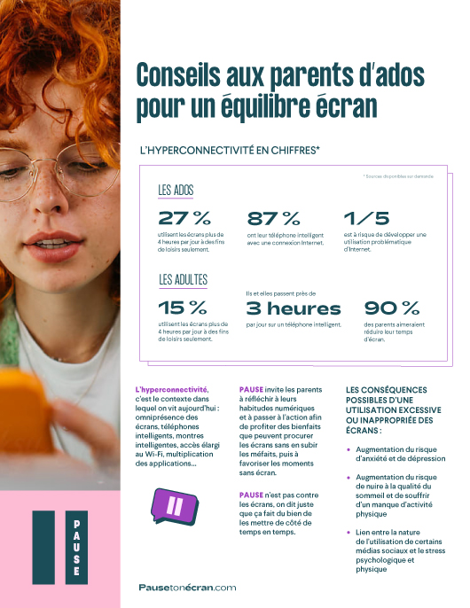 Fiche technique présentant des chiffres et des faits sur le phénomène de l’hyperconnectivité, ainsi que des infos et conseils pratiques destinés aux parents.