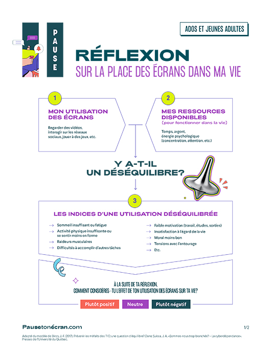Infographie destinée au personnel intervenant auprès des ados et des jeunes adultes. Elle permet une réflexion sur leurs habitudes numériques et fait réfléchir aux conséquences possibles d’une utilisation déséquilibrée des écrans.