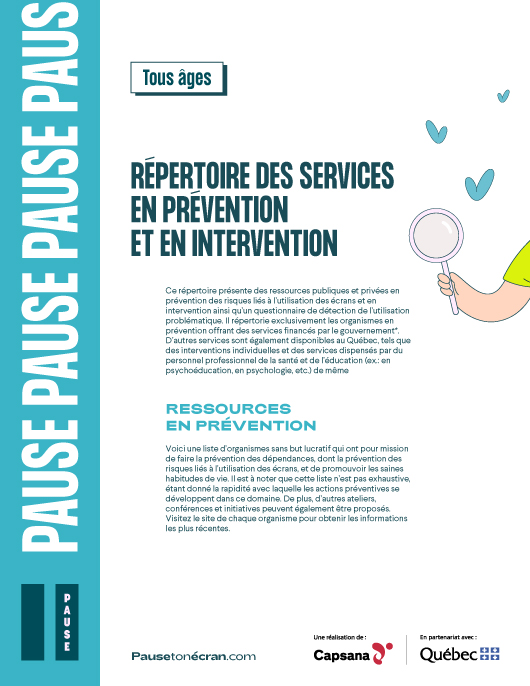 Outil d’évaluation clinique de la cyberdépendance, liste des organismes en prévention et en intervention en cyberdépendance, applications favorisant une meilleure gestion de son utilisation des écrans, livres et lectures intéressantes sur le sujet de l’hyperconnectivité.