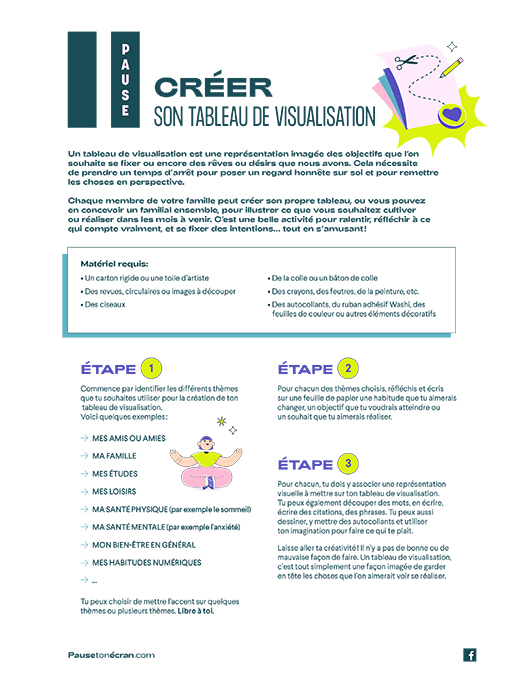 Activité créative à réaliser en famille. L’objectif est de prendre un temps d’arrêt, réfléchir à ce qui compte vraiment et illustrer ce que l’on souhaite réaliser dans les mois à venir.